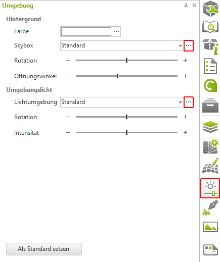Um das heruntergeladene Bild in visual-Store zu verwenden, klicken Sie rechts in der Toolbar auf den Button für Umgebung. Die Ladezeit des HDRI-Bildes ist abhängig von der Dateigröße und Auflösung.