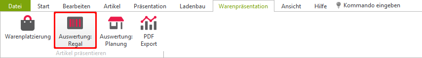 Um ein gesamtes Regal auszuwerten, wird im ersten Schritt das gewünschte Regal ausgewählt. Nun wird im Reiter Ladenbau der Punkt Auswertung: Regal ausgewählt. Es wird jetzt automatisch eine Auswertung des Regals vorgekommen. Ist diese abgeschlossen, öffnet sich ein Fenster, in dem alle Produkte des Regals mit ihren Eigenschaften aufgelistet werden.